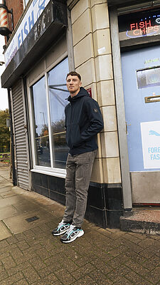 A: Trainers is easy, Air Max 95s. I would probably say my neon 95s but my dog decided to eat them a few months ago so they had to get binned. My favourite jacket is a bit more difficult. I’ve got a sky blue Stone Island cagoule that I love. It doesn’t come out very often because it’s abit bold for me but I get loads of comments on the odd occasion it does.