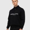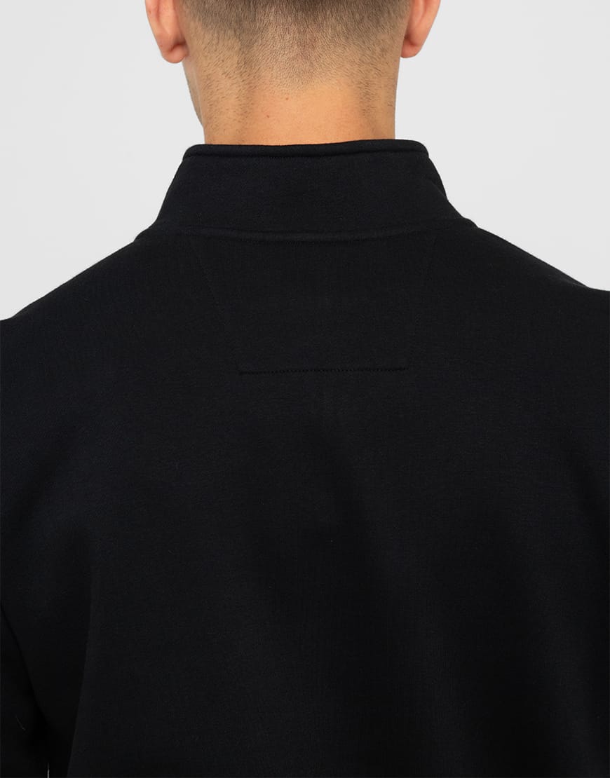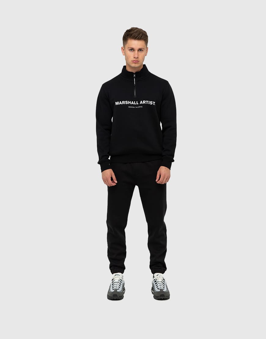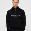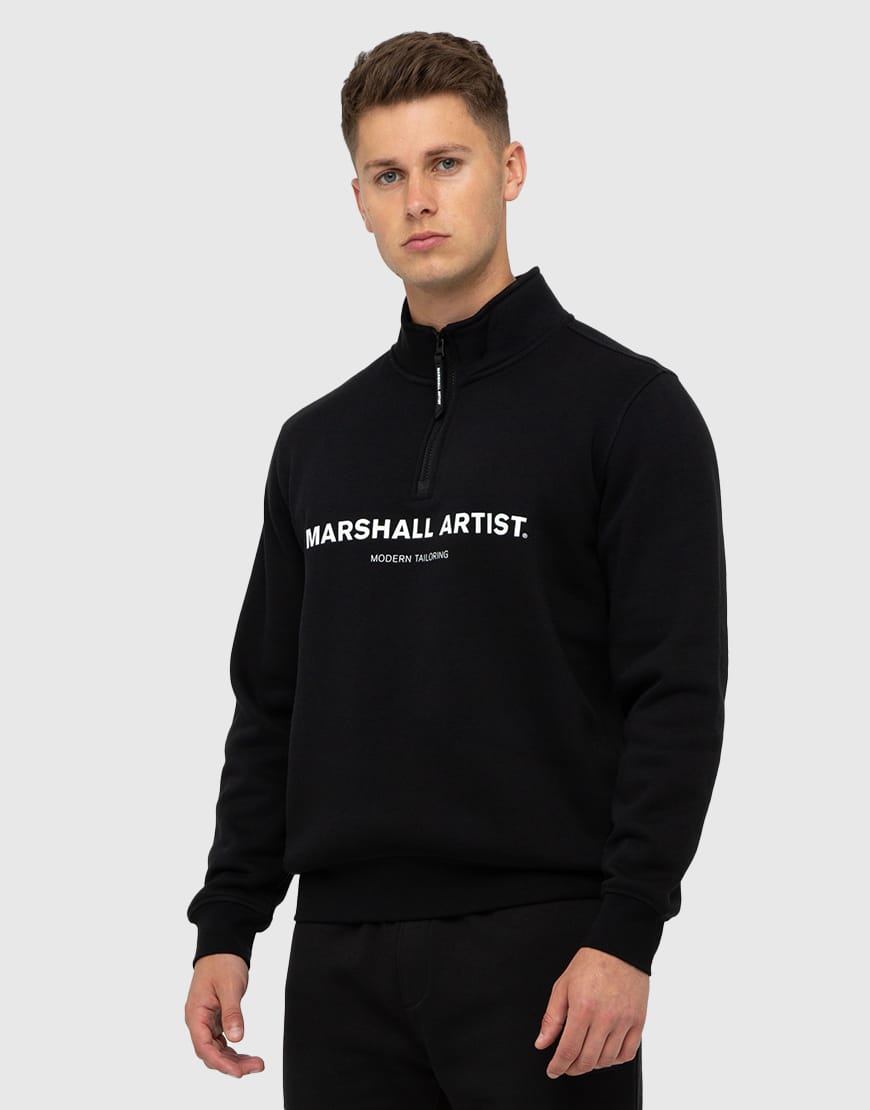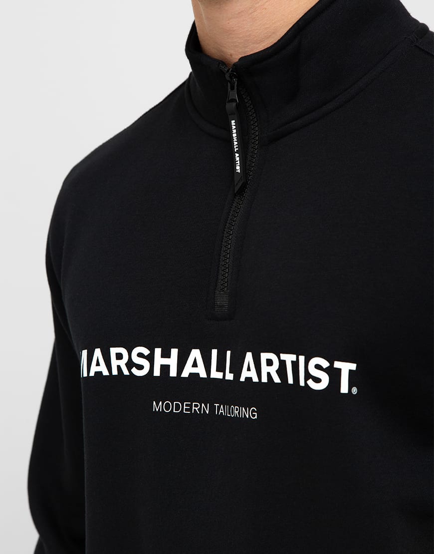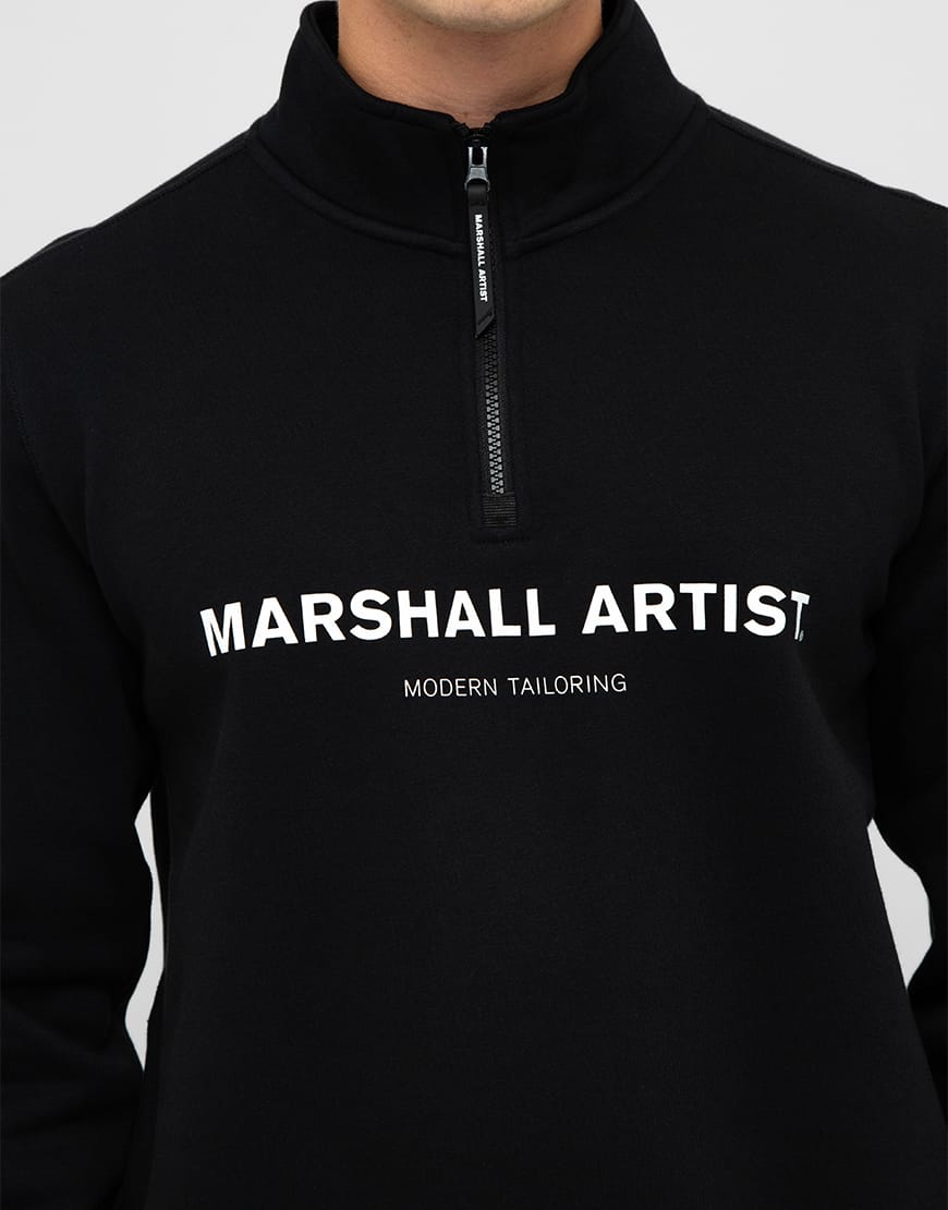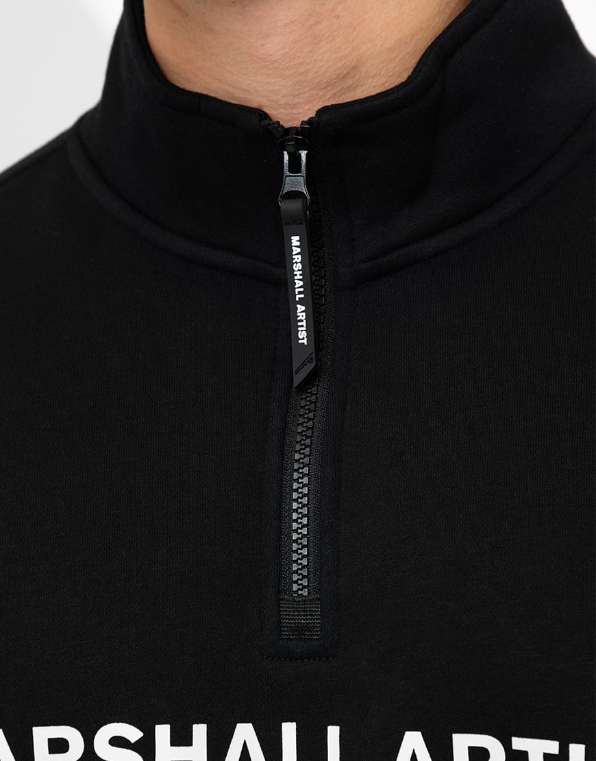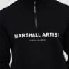Constructed from a 80% Cotton / 20% Polyester blend. Features half zip closure, ribbed cuff and sleeves. Rubber branded zip puller and side entry pockets. Finished with flatlock stitching at seams and large Mar- shall Artist print at CF chest.