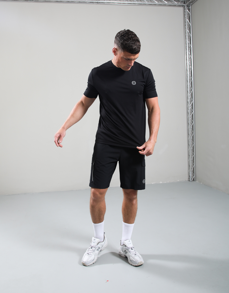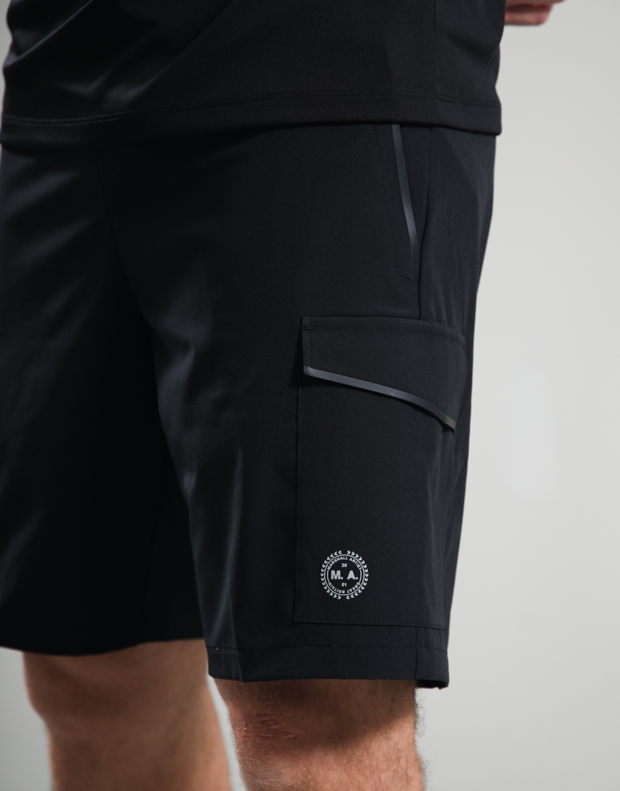 Trail Cargo Short constructed from a 4 way stretch polyester with articulated panelling for freedom of movement. Features cargo pockets to either side and drawcord waistband. Reflective prints to concealed leg pockets and concealed back pocket. Finished with reflective print to the right cargo pocket. Regular fit.